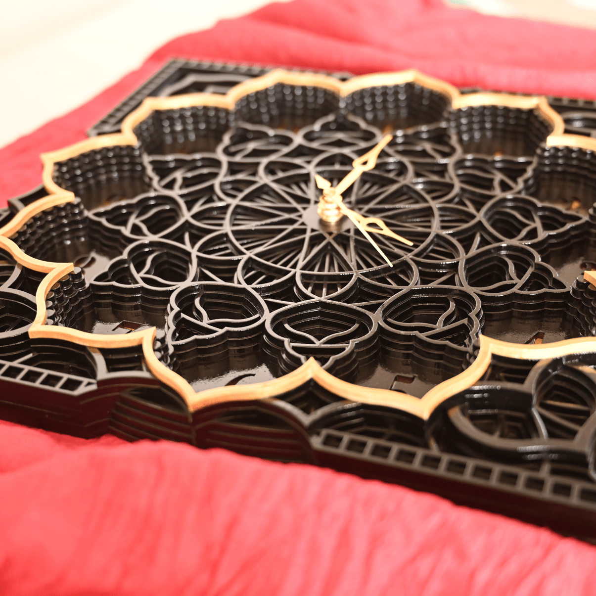 Add a touch of timeless elegance to your space with this beautifully crafted square black wooden mandala wall clock. The intricate mandala design is precision-cut into layered wood, with the top borders finished in a rich golden color that contrasts gracefully against the deep black base. Golden numbers enhance readability while maintaining a luxurious look. This wall clock not only keeps perfect time but also doubles as a stunning piece of wall art, ideal for living rooms, offices, meditation spaces, or gifting.