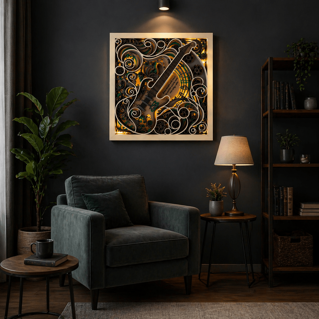 Designed with precision, this piece features a guitar silhouette surrounded by intricate mandala-inspired patterns, creating depth through multiple layered elements. The blend of earthy tones with subtle pops of green and orange adds warmth and character, making it a standout addition to any room.