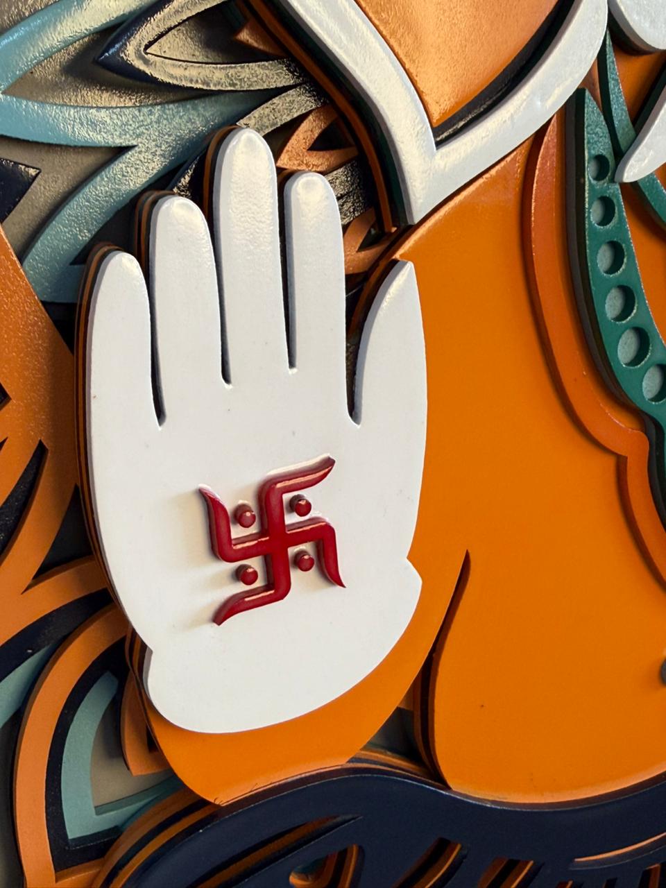 The vibrant combination of saffron, teal, white, and deep blue adds a modern yet traditional touch, making it suitable for both contemporary and ethnic interiors. The intricate lotus-mandala pattern surrounding Ganesha symbolizes harmony, protection, and prosperity—perfect for entryways, living rooms, puja rooms, offices, studios, or gifting.